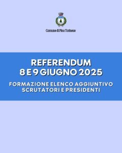 Gli elettori iscritti nelle liste elettorali di Pino Torinese e di cittadinanza italiana sono invitati a rendere la preventiva disponibilità a svolgere le funzioni di Scrutatore o Presidente di seggio, anche se NON già iscritti nei relativi elenchi, in occasione delle consultazioni referendarie dell’8 e 9 giugno 2025.