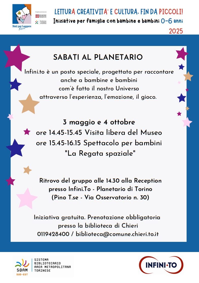 Nell’ambito del progetto Nati per Leggere/Lettura creatività e cultura, fin da piccoli, la Biblioteca civica di Chieri organizza presso il Planetario di Torino un’iniziativa rivolta a famiglie con bambini e bambine.