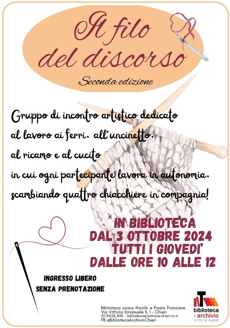 Allora vi aspettiamo tutti i giovedì mattina (fino al 29 maggio 2025 dalle ore 10 alle ore 12) al Gruppo di incontro artistico presso il laboratorio lettura adulti della Biblioteca civica di Chieri per la seconda edizione del progetto Il filo del discorso.
