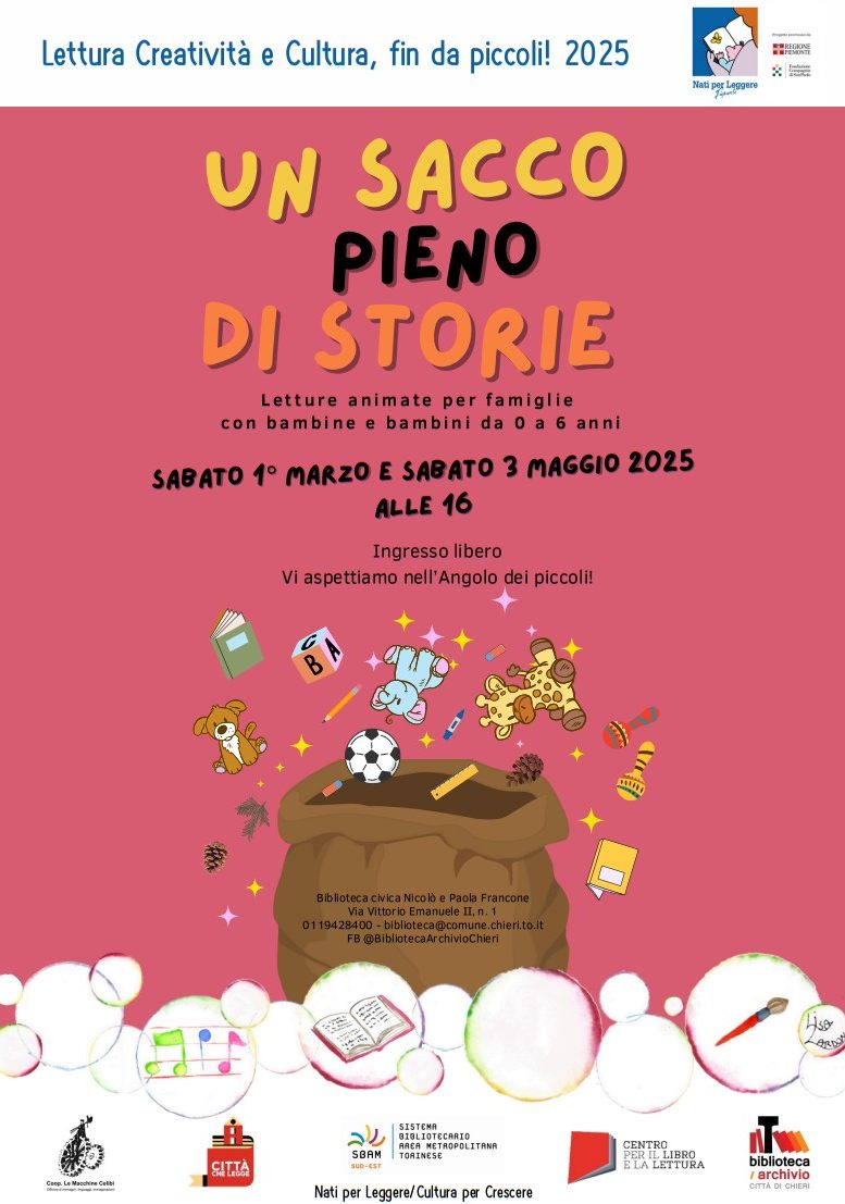 Sabato 3 maggio 2025 alle ore 16 presso l’angolo dei piccoli della Biblioteca civica di Chieri si terrà l’attività “Un sacco pieno di storie”.