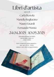 Nella mostra “Libri d’artista” realizzata anche in omaggio a Carla Bertola, editrice e artista mancata nel 2023 e della quale sono mostrati una serie di lavori, Mariella Bogliacino, Fernando Montà e Mauro Lisardi espongono alcune delle loro opere che accomunano il loro sentire sul terreno della sperimentazione, guardando sempre con rispetto e ammirazione a un periodo dal forte impulso utopico e collaborativo che ha dato vita a movimenti artistici e culturali come il Futurismo, l’Espressionismo, il Cubismo, il Surrealismo, solo per citarne alcuni.