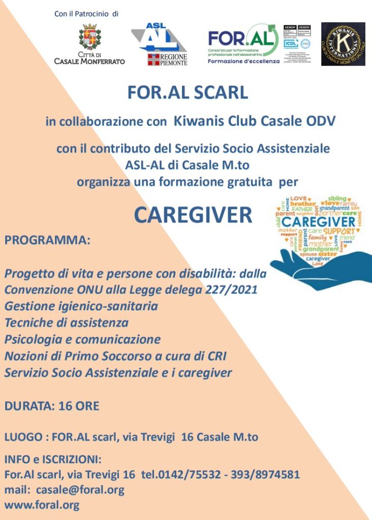 Prenderà il via giovedì 8 maggio 2025, presso la sede For.Al “A. Trevigi”, il corso gratuito di formazione per caregiver, organizzato da For.Al in collaborazione con Kiwanis Club Casale ODV, con il patrocinio del Comune di Casale Monferrato e il sostegno del Servizio Socio Assistenziale ASL AL.