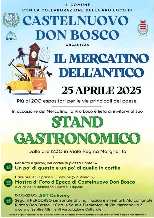 Castelnuovo don Bosco. 25 aprile, torna il Mercatino dell’Antico di Redazione · 24 Aprile 2025 Visto da: 722