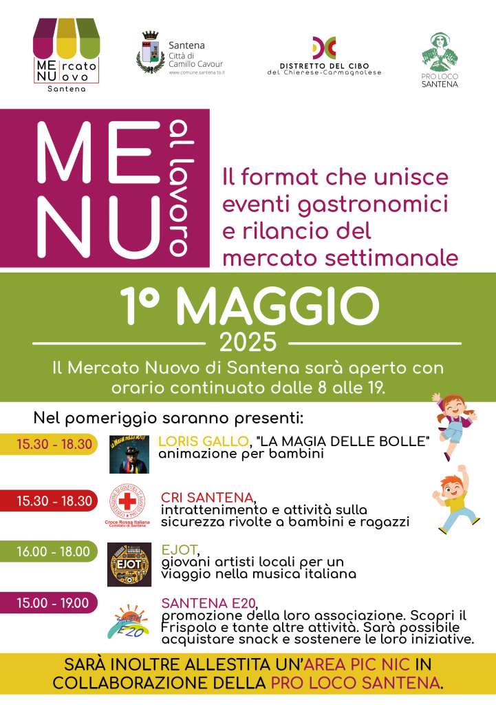 SANTENA 24 APRILE 2025 – Una giornata di festa, ma anche un’occasione per sostenere il commercio locale e vivere il mercato cittadino in modo nuovo. Giovedì 1° maggio 2025, in occasione della Festa dei Lavoratori, il Mercato Nuovo di Santena sarà aperto con orario continuato dalle 8 alle 19 e ospiterà attività, musica e animazione per grandi e piccoli, grazie al format “Me.nu al lavoro”, che unisce eventi gastronomici e rilancio del mercato settimanale.