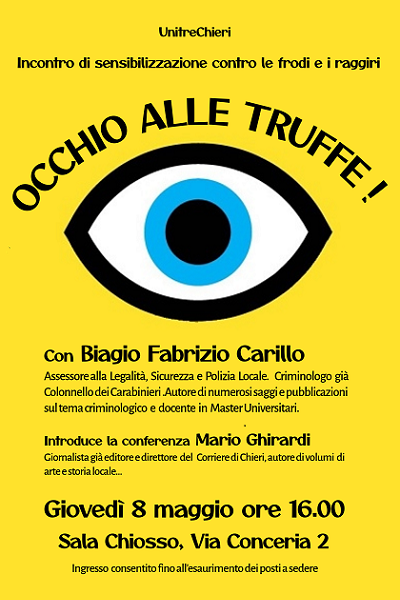 Per fornire strumenti di difesa l’Unitre di Chieri ha organizzato per giovedì 8 maggio , alle ore 16,00, presso la Sala Chiosso in Via Conceria 2, un incontro con Biagio Fabrizio Carillo, stimato criminologo già Colonnello dei Carabinieri, autore di numerosi saggi e pubblicazioni sul tema criminologico e docente in Master Universitari, e Assessore al Commercio, Polizia Locale e alla Sicurezza presso il Comune di Chieri