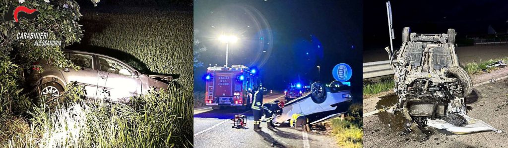 Sale – S.S. 211 km 24: incidente nella notte tra due autovetture, con i mezzi che a seguito del violento impatto si sono ribaltati e uno dei due ha terminato la carambola in un fosso.