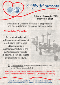Sul filo del racconto: sabato 10 maggio passeggia con noi per le strade della Chieri del Tessile, per scoprire i luoghi di produzione di tendaggi, abbigliamento e passamanerie che custodiscono le vicende di aziende e famiglie legate all’arte della tessitura. Ritrovo alle ore 15:15 presso la piazzetta della Biblioteca Civica, in via Vittorio Emanuele II, 1. Al termine del tour i partecipanti saranno accolti al Museo del Tessile per una visita offerta dalla Fondazione Chierese per il Tessile.