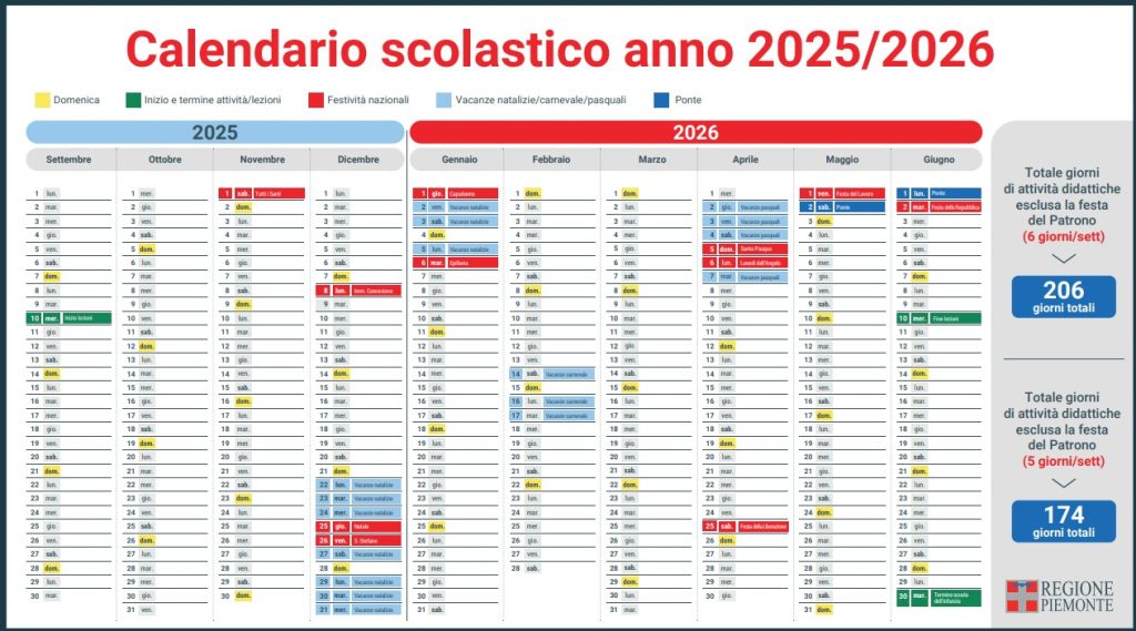 E’ stato definito il calendario scolastico 2025-2026. L’anno inizierà mercoledì 10 settembre per terminare mercoledì 10 giugno (martedì 30 giugno per le scuole dell’infanzia). Il calendario approvato dalla Giunta regionale su proposta del Vicepresidente con delega all’Istruzione e Merito, Elena Chiorino, comprende 206 giorni di lezione in aula negli istituti in cui si frequenta dal lunedì al sabato, 174 dove si resta in classe fino al venerdì. Potranno ridursi di un giorno per la ricorrenza del Santo Patrono. In considerazione del servizio svolto, le scuole dell’infanzia potranno anticipare l’inizio delle lezioni.