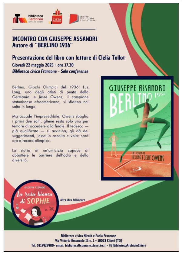 lo scrittore di narrativa per ragazzi Giuseppe Assandri presenta presso la Sala conferenze della Biblioteca civica di Chieri il suo ultimo libro “Berlino 1936 – La storia di Luz Long e Jesse Owens” (San Paolo Edizioni), che narra le vicende di due campioni di estrazione sociale molto differente: Long, tedesco benestante e Owens, statunitense afroamericano di umili origini. L’incontro tra i due e la nascita di un’amicizia riusciranno ad abbattere le barriere dell’odio e della diversità.