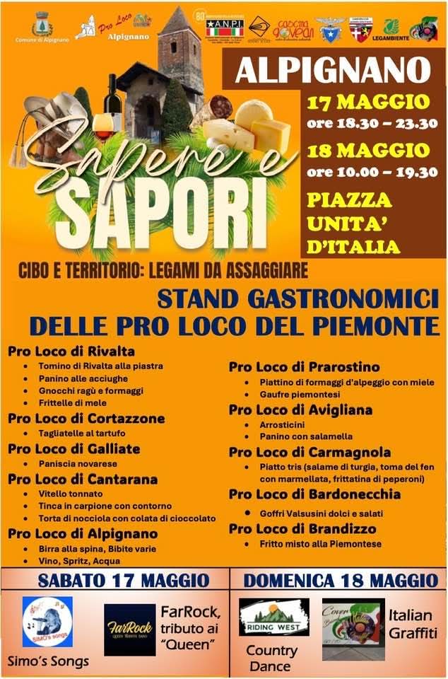 ALPIGNANO Sabato 17 domenica 18 maggio “SAPERE e SAPORI” con Stand delle Pro Loco del Piemonte.