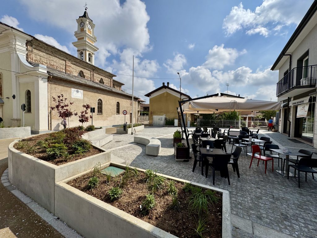 Ora lo spazio tra le attività commerciali e la chiesa non è più una semplice e pericolosa area di transito ma una vera e propria piazza dove poter camminare e socializzare in tranquillità. Qui il porfido ha preso il posto dell’asfalto, che è stato rifatto invece nella sede stradale con un color “terra” e rialzato in modo da creare una piazza traversante per indurre le auto a rallentare. Agli angoli sono state installate delle fioriere di cemento che rendono più sicuro l’incrocio e consentono una piacevole sosta grazie alle panchine e alle essenze piantumate e curate a proprie spese dall’Agriturismo Tetto Garrone. Così come è stato allargato il marciapiede a valle della chiesa grazie alla collaborazione della parrocchia, che ha ceduto 21 metri in lunghezza.