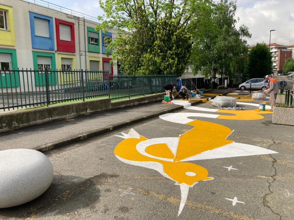 Il colore giallo illuminerà il grigio dell’asfalto con le forme ideate nei laboratori di street art curati da Oscar Cauda e LAQUP APS con le classi della scuola; le sedute di design, scelte dall’amministrazione comunale a partire dalle esigenze espresse dai bambini, permetteranno a genitori e nonni di sedersi davanti a scuola e ai più piccoli di inventare nuovi giochi, oltre a quelli disegnati sulla pavimentazione dell’area, delimitata da dissuasori e fioriere.