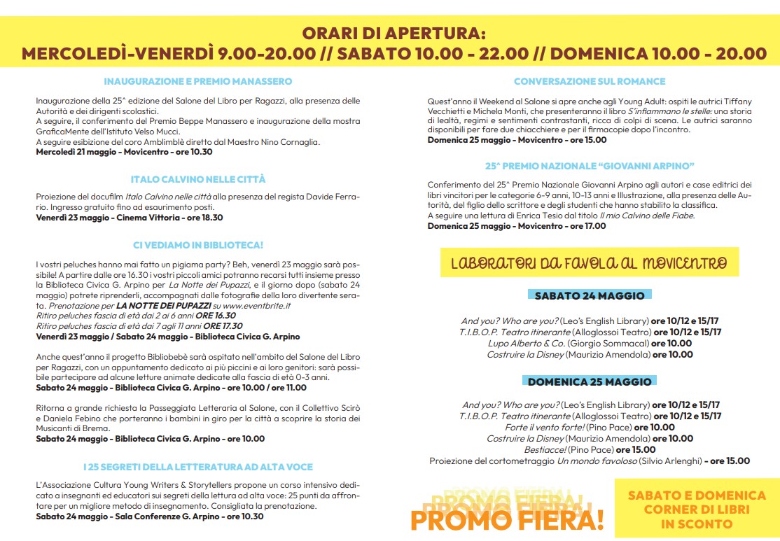 Anche quest’anno non manca lo Speciale Weekend Famiglie al Salone, tra laboratori, libri da sfogliare e acquistare, peluche, Bibliobebè e Passeggiate letterarie, corsi, presentazioni, ospiti e la tradizionale consegna del Premio nazionale “Giovanni Arpino”, giunto alla sua 25esima edizione, seguito da una speciale lettura di Enrica Tesio su Calvino. Di seguito tutto il programma dettagliato: