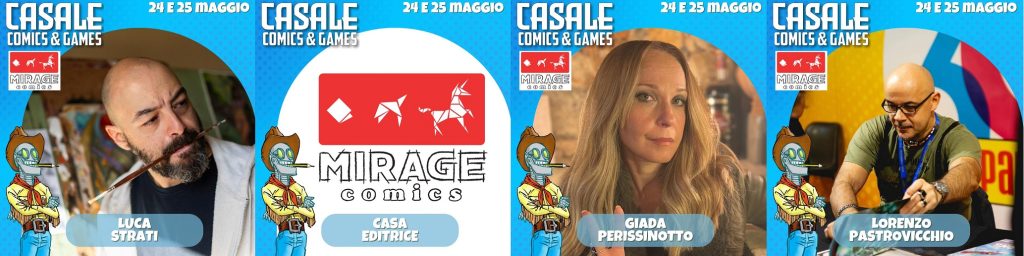 Allo stand della Mirage Comics si potranno incontrare: Luca Strati, autore per Marvel, DC Comics, Dynamite Comics e Heavy Metal, Lorenzo Pastrovicchio, disegnatore Disney (sue le straordinarie copertine Disney/Marvel per i 100 anni della Disney) e Giada Perissinotto, disegnatrice Disney di Topolino & C., ma anche per W.I.T.C.H., Star Wars e Marvel.