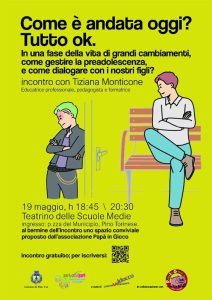 Lunedì 19 maggio avrà luogo l’incontro gratuito “Come è andata oggi? Tutto ok” con Tiziana Monticone, Educatrice professionale, Pedagogista e formatrice.