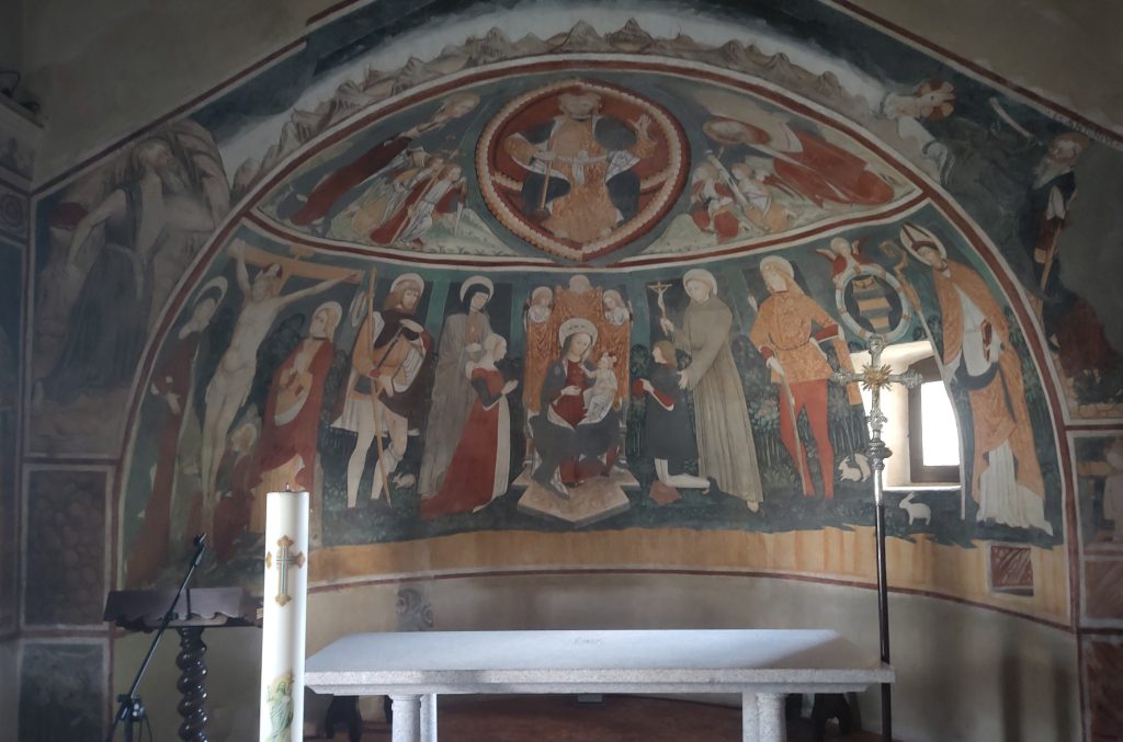 La chiesetta all’inizio, doveva funzionare come luogo di preghiera per i contadini. L’ampliamento e i raffreschi risalgono al 1487- 88 e sono testimoniati dallo stemma araldico dei Tettoni che si trova nel semi cilindro dell’abside.