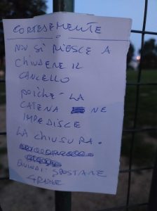 Lasciando infatti la catena legata al lucchetto, posizionata tra i due battenti come da immagine allegata, lo spessore della medesima impedisce l’aggancio del chiavistello ed il cancello rimane soltanto accostato ma non chiuso, con conseguente e possibile rischio di uscita di qualche cane che potrebbe andare incontro ad oggettivi pericoli, finendo su Strada Roaschia con conseguenze indesiderate, idem dicasi per l’adiacente area bimbi.