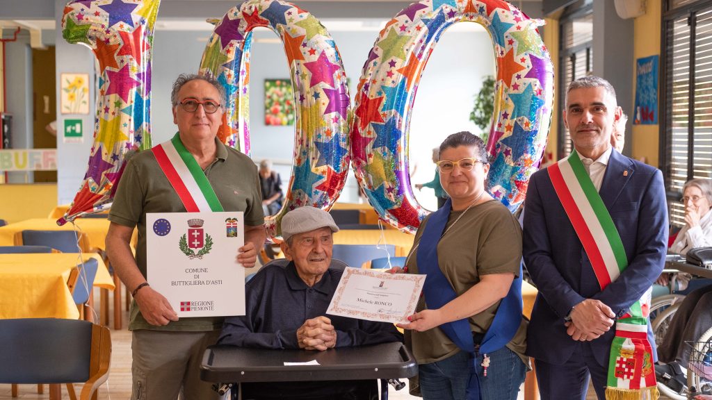 Festa in famiglia per i cent’anni di Michele Ronco alla Fondazione Rossi di Buttigliera d’Asti. Con Michele i due figli, Bartolomeo e Caterina, nipoti e familiari.