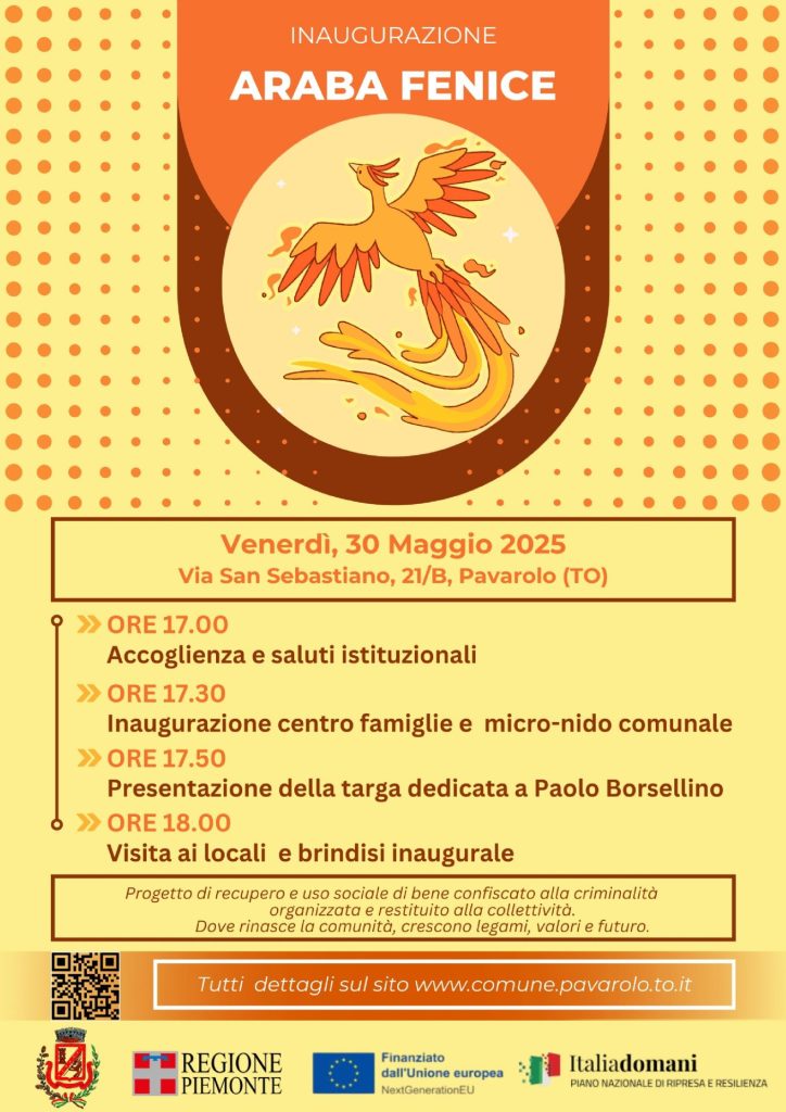Nel pomeriggio dello stesso giorno, a Pavarolo, è stato inaugurato Araba Fenice, centro famiglia e micronido: un progetto di recupero e uso sociale di bene confiscato alla criminalità organizzata e restituito alla collettività