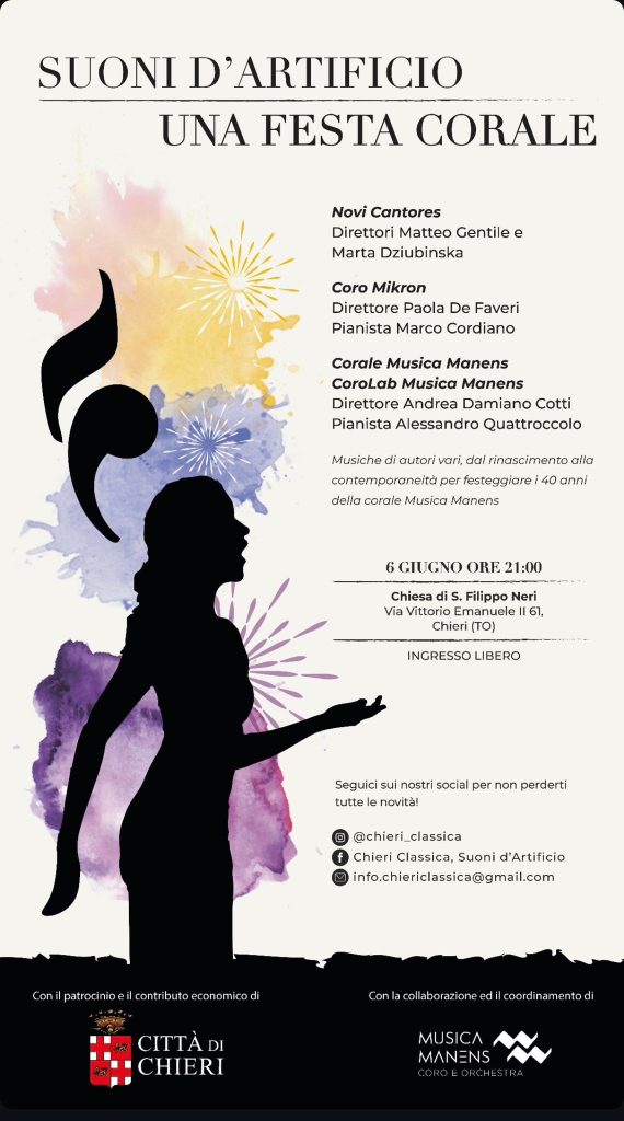 A Chieri inizia venerdì 6 giugno la rassegna “Suoni d’Artificio” con un concerto in San Filippo che celebra i 40 anni del gruppo corale Musica Manens.