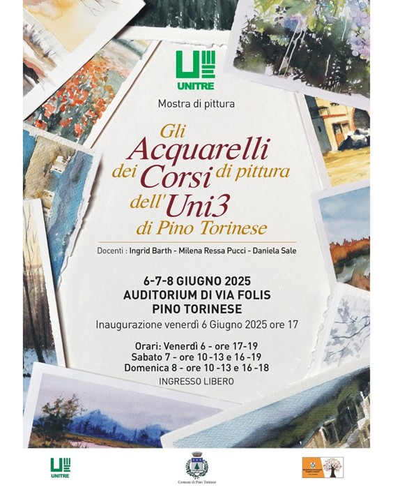 Dal 6 all’8 giugno, in Auditorium negli orari indicati nella locandina si può visitare la Mostra di acquerelli dell’Unitre di Pino Torinese.