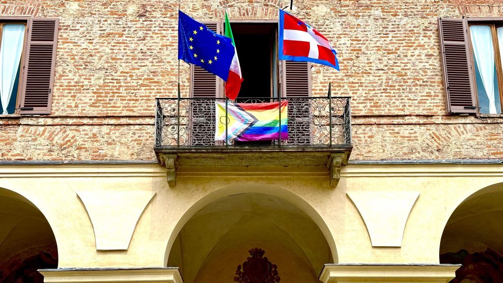 “In vista del Torino Pride 2025, il Comune di Chieri espone su un balcone del Municipio la bandiera arcobaleno persostenere i diritti della comunità LGBTQIA+