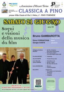 Concerto del 21 giugno – ore 21:00“Sogni e visioni della musica da film” con Bruno Gambarotta, Giorgio Costa ed Elena Cornacchia.Giardino di Villa Grazia, Via San Felice, 2 – Pino TorineseBiglietto: 15 euroAcquisto online: https://www.clappit.com/biglietti/classica-a-pino-2025-21-giugno-2025-giardino-villa-grazia-san-felice-33131.html