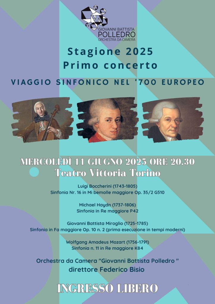 L’Orchestra da Camera Giovanni Battista Polledro, diretta dal Maestro Federico Bisio, proporrà la musica di quattro compositori del Settecento, italiani e europei. Il pubblico potrà immergersi negli spartiti di Luigi Boccherini (1743-1805), Sinfonia Nr. 16 in Mi bemolle maggiore Op. 35/2 G510, Michael Haydn (1737-1806), Sinfonia in Re maggiore P42, Giovanni Battista Miroglio (1725-1785), Sinfonia in Fa maggiore Op. 10 n. 2 (prima esecuzione in tempi moderni), Wolfgang Amadeus Mozart (1756-1791), Sinfonia n. 11 in Re maggiore K84. L’ingresso alla sala del Teatro Vittoria sarà a offerta libera.