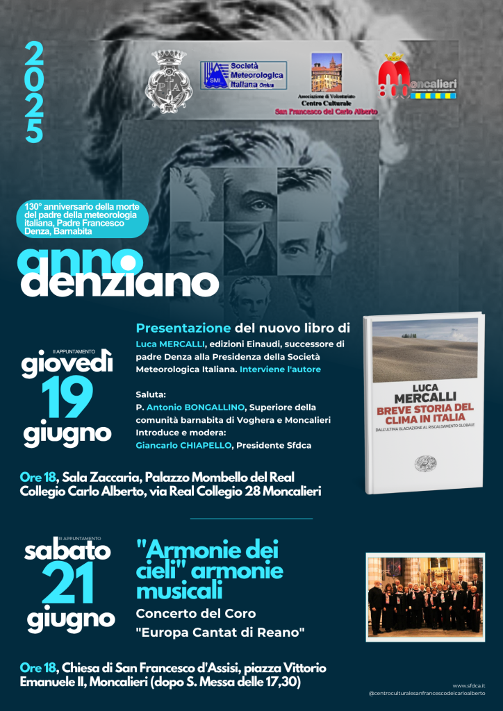 – Giovedì 19 giugno ore 18, Palazzo Mombello del Real Collegio Carlo Alberto, via Carlo Alberto 28, Moncalieri, presentazione dell’ultimo libro del successore di Denza, Luca Mercalli “Breve storia del clima in Italia, ed. Einaudi editore. Introduce Padre Antonio Bongallino, Superiore della comunità barnabita di Voghera e Moncalieri. Introduce e modera il Presidente sfdca Giancarlo Chiapello