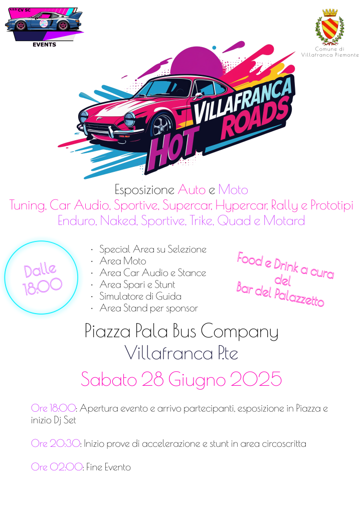 Villafranca Hot Roads è un car & bike meeting serale pensato per coinvolgere tutti gli appassionati del settore, in una location centrale e facilmente raggiungibile. L’evento si svilupperà in più aree tematiche, accogliendo veicoli di ogni categoria e stile: