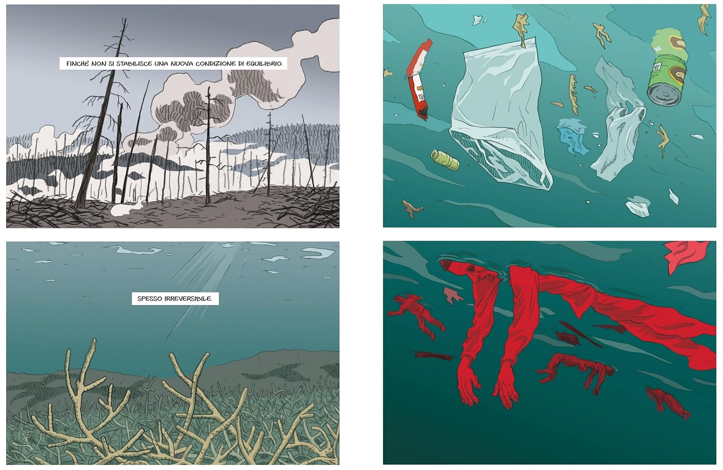 Sono a fumetti anche molti reportage giornalistici su temi relativi al cambiamento climatico, come Tributo alla Terra di Joe Sacco (l’autore di Palestina, di cui ho parlato in un recente articolo) e il best seller francese Il mondo senza fine, nato dalla collaborazione del professor Jean-Marc Jancovici, esperto di clima ed energia, e del disegnatore Christophe Blain. Si parla spesso delle problematiche relative al cambiamento climatico in modo specifico e dettagliato nei reportage giornalistici a fumetti de La Revue, la rivista indipendente di giornalismo disegnato nata nel 2022 (di cui potete leggere i due miei precedenti articoli ai seguenti link: il giornalismo indipendente e un anno dopo).