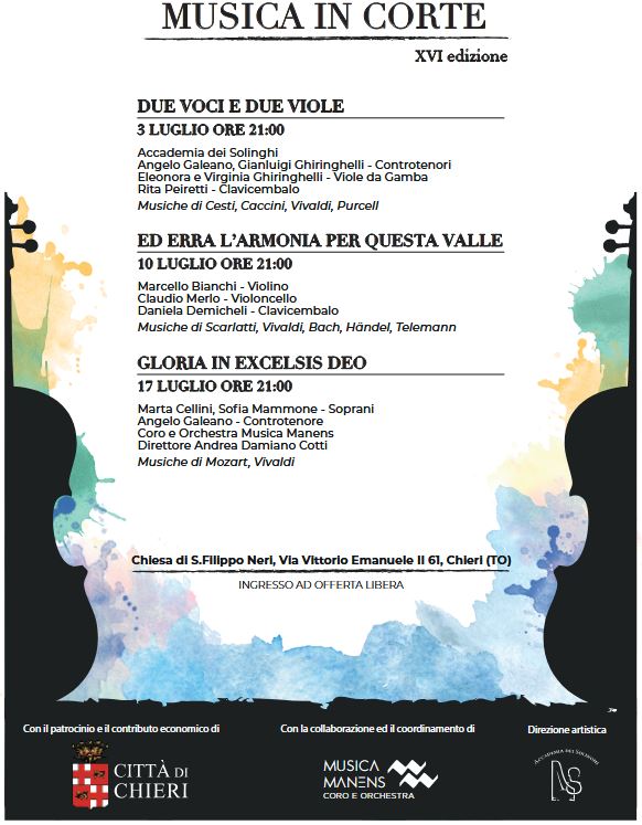 Il 3 luglio inizierà la XVI edizione di Musica in Corte a Chieri, organizzata dall‘Accademia dei Solinghi.