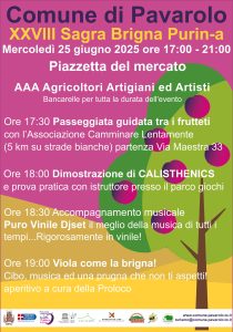 L’appuntamento con la Sagra della Brigna Purin-a, patrocinata dalla Città metropolitana di Torino, quest’anno è fissato per mercoledì 25 giugno nella piazzetta del mercato in via Maestra. Saranno presenti agricoltori, artigiani e artisti ed è in programma una passeggiata guidata tra i frutteti, in collaborazione con l’associazione Camminare Lentamente, che proporrà un itinerario di circa 5 km su strade bianche. Alle 18 è in programma una dimostrazione con prova pratica di callistenia, disciplina sportiva che utilizza il peso del corpo come resistenza per sviluppare l’armonia e la forza.