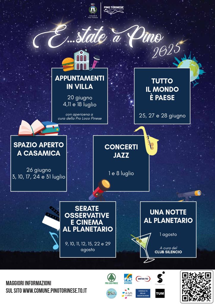 “La musica sarà protagonista con appuntamenti jazz e serate jam session e dj set per i giovani, ma non mancheranno le proposte culturali in compagnia di esperti, la condivisione di ottime proposte gastronomiche, gli appuntamenti dedicati all’inclusione e al dialogo interculturale, la magia delle osservazioni astronomiche e del cinema sotto le stelle – aggiunge l’Assessora alla Cultura ed Eventi Elisa Pagliasso -. Tutti questi eventi si svolgono nei luoghi simbolici di Pino, come Villa Grazia, il Planetario, CasAmica e l’ex impianto di risalita, proprio con l’intento di valorizzarli e far vivere il nostro territorio nella sua bellezza, sotto un cielo estivo che ogni sera ci regala nuove emozioni. Vi aspettiamo!”.