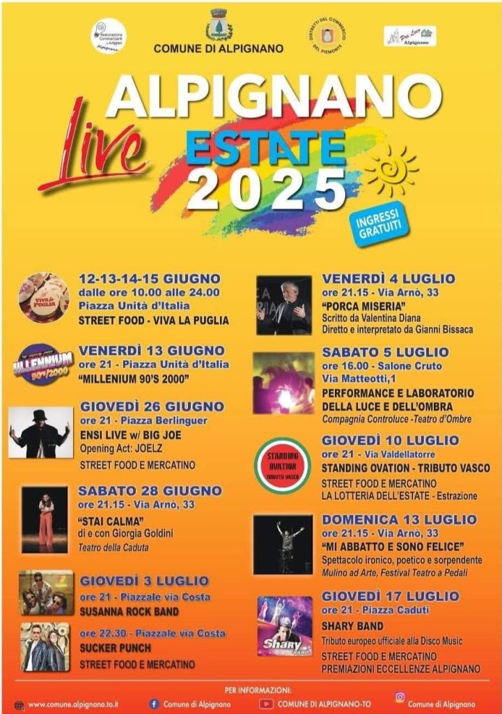“Alpignano Live” è organizzato dal comune di Alpignano, la Pro loco e l’associazione commercianti e artigiani.