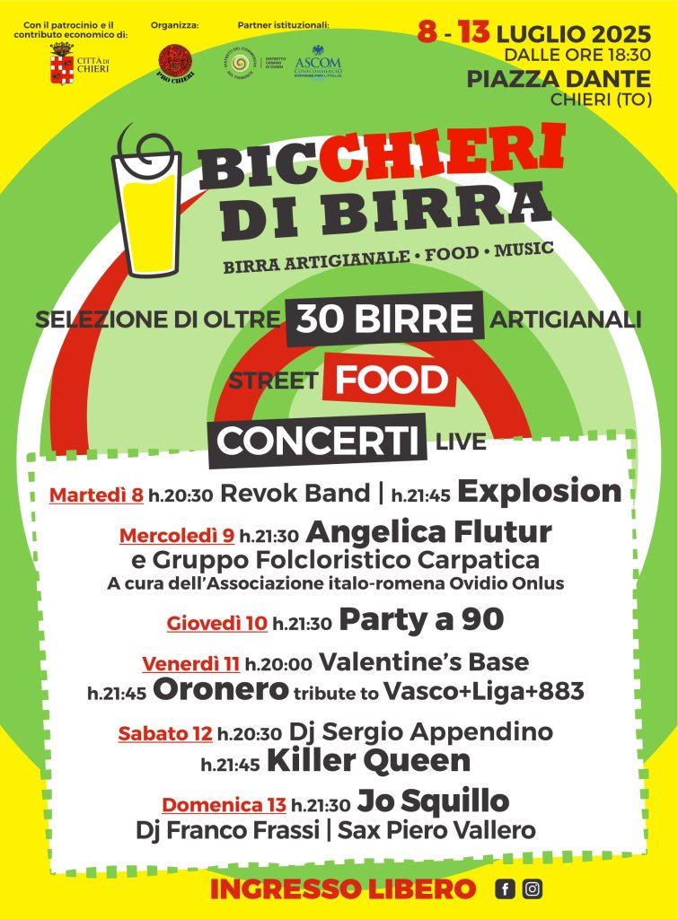 Chieri. “BicChieri di Birra 2025” dall’ 8 al 13 luglio in Piazza Dante 🗓