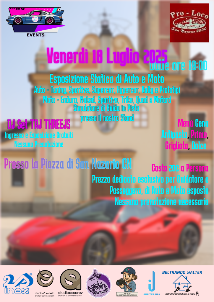 Una serata all’aperto, tra motori, passione, divertimento e buon cibo, realizzata in collaborazione con la Pro Loco di San Nazario di Narzole, all’interno della suggestiva cornice della piazza centrale del paese.