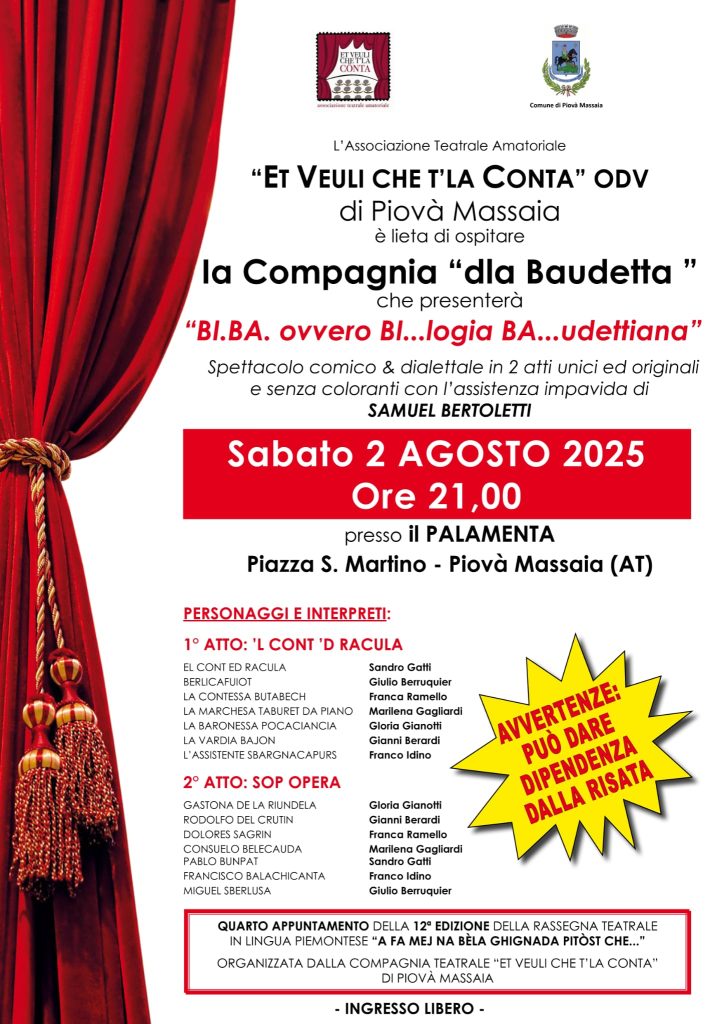 PIOVA’ MASSAIA. Sabato 2 agosto “BI.BA. ovvero BI…logia BA…udettiana” presentato dalla Compagnia “Dla Baudetta” presso il Palamenta.
