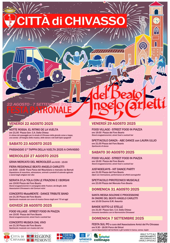 Domenica 31 agosto, alle ore 11, nella Chiesa Collegiata di Santa Maria Assunta sarà celebrata la messa solenne in onore del Beato Angelo Carletti. In serata, alle ore 21, in piazza Dalla Chiesa, le filarmoniche chivassesi si esibiranno nel concerto “Bande sotto le stelle”.