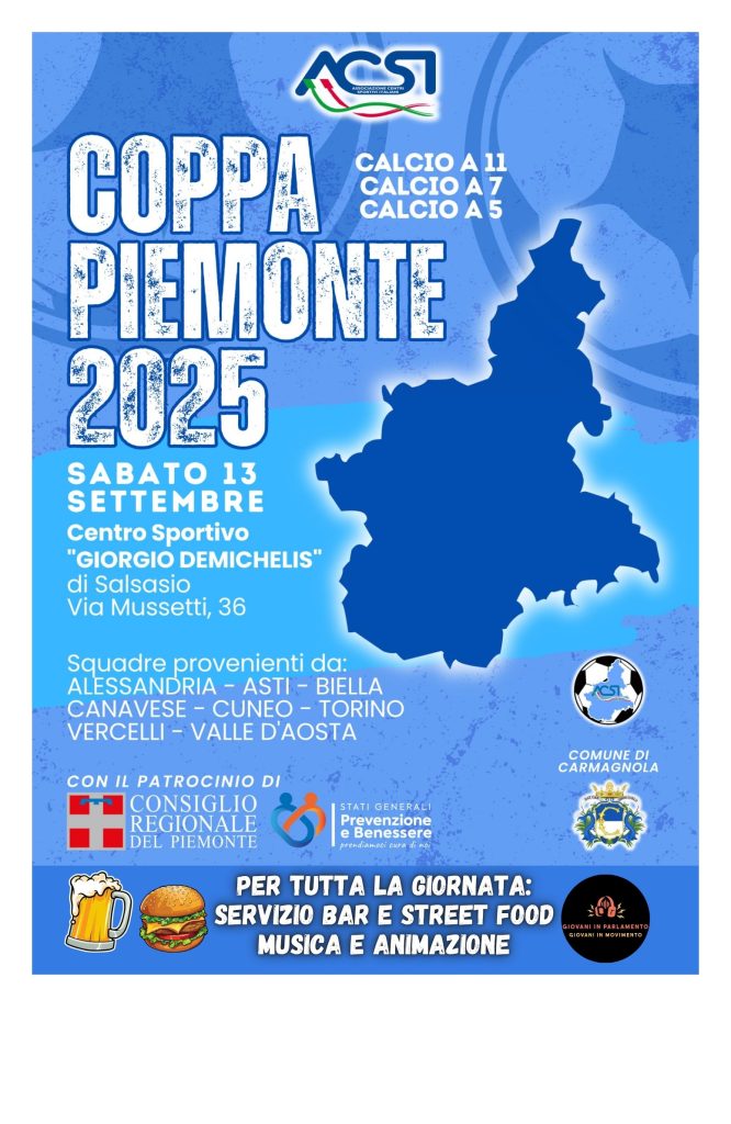 L’Acsi (Associazione Centri Sportivi Italiani) e l’Asd Salsasio hanno reso pubblico il programma del grande evento di sabato 13 settembre nel centro sportivo di Salsasio in via Mussetti 32 a Carmagnola. Si svolgerà la Coppa Piemonte ACSI di calcio A11, calcio A7 e calcio A5 che porterà a Carmagnola oltre 300 atleti da Alessandria, Asti, Biella, dal Canavese, Cuneo, Torino, Vercelli e dalla Valle d’Aosta.Ecco la time line dell’evento organizzato da ACSI Piemonte Lega Cuneo. Alle 10,30, ritrovo delle squadre e riunione organizzativa a cui seguirà alle 11 il fischio d’inizio su tutti e tre i campi (A11, A7 e A5). Per tutta la giornata partite di calcio A11, calcio A7 e calcio A5 sui campi di Salsasio. A pranzo e a cena street food con pasta a cura di Pasta Berruto e hamburger con Grand e Gross oltre a birra e molto altro. Per informazioni e prenotazioni per il pranzo è la cena contattare su WhatsApp il numero 3456147782. Per tutto il giorno sarà attivo il servizio bar e street food all’interno del centro sportivo Demichelis. Tutto il pomeriggio e la sera inoltre ci sarà musica e intrattenimento con “I Giovani in Parlamento”. Alla sera alle 20,30 sul campo principale si svolgeranno le premiazioni ed i saluti istituzionali. L’evento è organizzato con il patrocinio del Consiglio Regionale del Piemonte e della Città di Carmagnola.