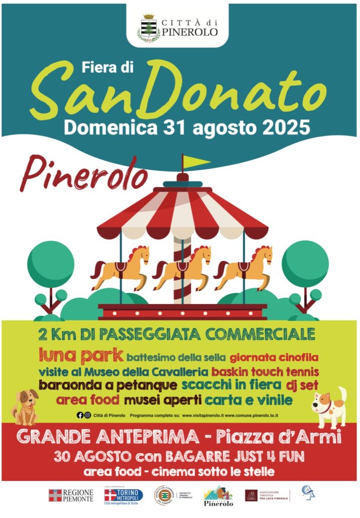 Pinerolo si prepara a vivere la tradizionale Fiera di San Donato 2025, in programma domenica 31 agosto, con una ricca anteprima il pomeriggio e la sera di sabato 30 agosto. Due giorni di eventi che mescolano sport, cultura, gastronomia ma anche un nuovo evento in Piazza D’Armi: la giornata sarà quest’anno dedicata ai cani con le spettacolari esercitazioni dei gruppi cinofili del territorio e la sfilata di tanti amici a quattro zampe che ha già registrato oltre 60 iscrizioni. Organizzata dalla Città di Pinerolo, con il patrocinio di Regione Piemonte e Città Metropolitana di Torino, e grazie alla collaborazione di tante realtà del territorio, la Fiera torna a colorare le strade con bancarelle, spettacoli, tornei sportivi, luna park, musica, cinema all’aperto e molto altro.