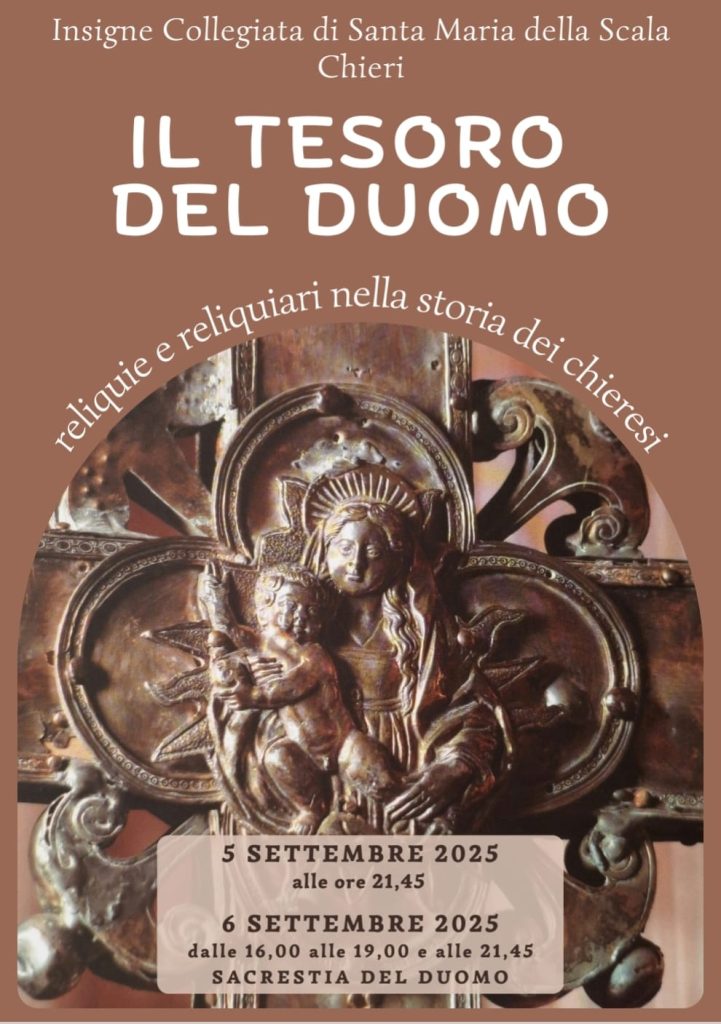 In questo Anno Santo, Giubileo della speranza, e in concomitanza con la Festa della Madonna delle Grazie il parroco don Marco Di Matteo ha pensato, per solennizzare questo momento così importante, di esporre straordinariamente il Tesoro del Duomo di Chieri, affidandone a Roberto Toffanello la cura e l’esposizione presso la Sacrestia del Duomo nei giorni: venerdì 5 settembre alle ore 21.45 (dopo la celebrazione della novena) e sabato 6 settembre dalle ore 16 alle ore 19 e alle ore 21. 45 (dopo la celebrazione della novena).