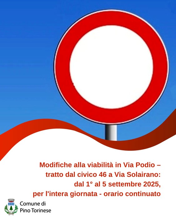 Via Podio, nel tratto dal civico 46 a Via Solairano, sarà chiusa alla circolazione veicolare per l’intera giornata, dal giorno 1/09 al giorno 5/09/2025, per l’esecuzione dei lavori di riasfaltatura.