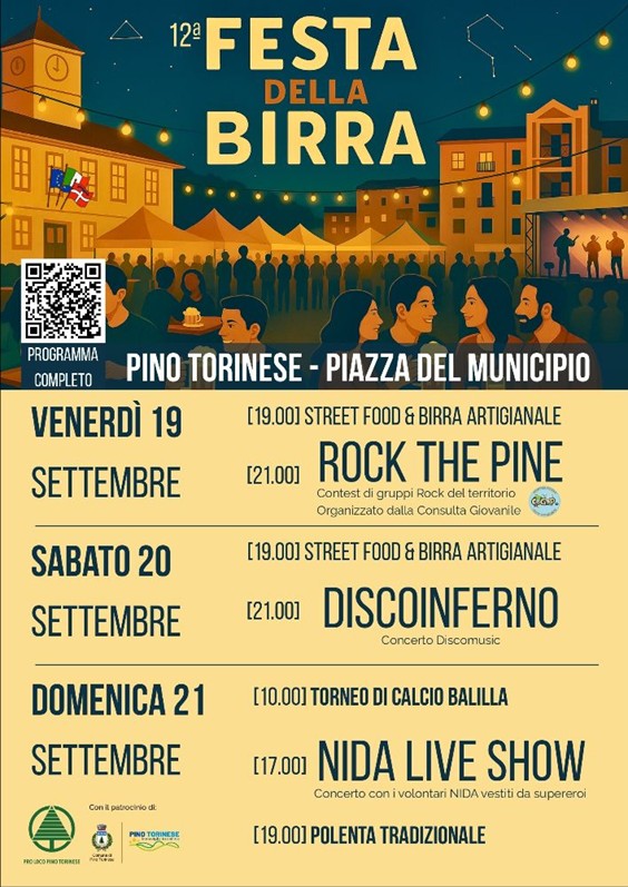E come da tradizione dal 19 al 21 settembre il cuore di Pino si accende! Piazza del Municipio ospiterà un weekend ricco di eventi: si parte venerdì con la quarta edizione di Rock the Pine, il contest musicale per band locali, in contemporanea con la 12ª Festa della Birra, che proseguirà anche il sabato con un’ampia proposta di birre artigianali e street food. La stessa sera si terrà anche l’attesissimo show dei Discoinferno. Gran finale domenica con la Festa Popolare: torneo di calciobalilla, concerto “NIDA Live Show” e la tradizionale polentata.