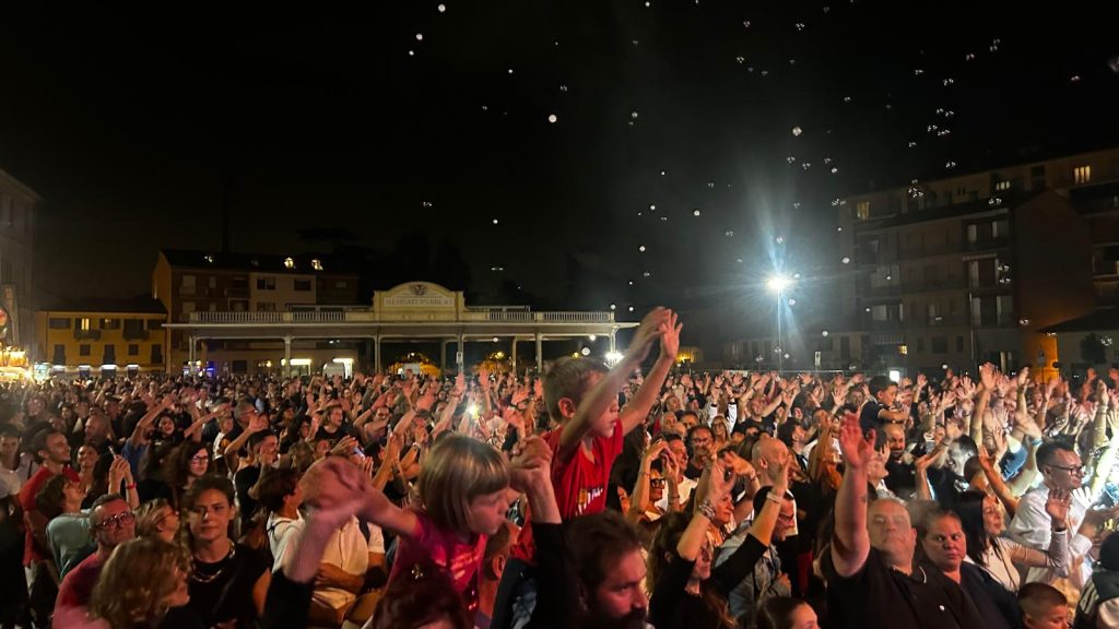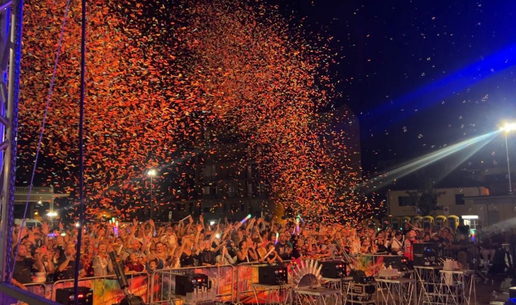 Migliaia di mani alzate al ritmo delle hit più ballate di sempre, un’ energia travolgente, coriandoli, bolle, macchine del fumo, scintille di fuoco e i bellissimi fuochi d’artificio hanno animato Piazza Dante.