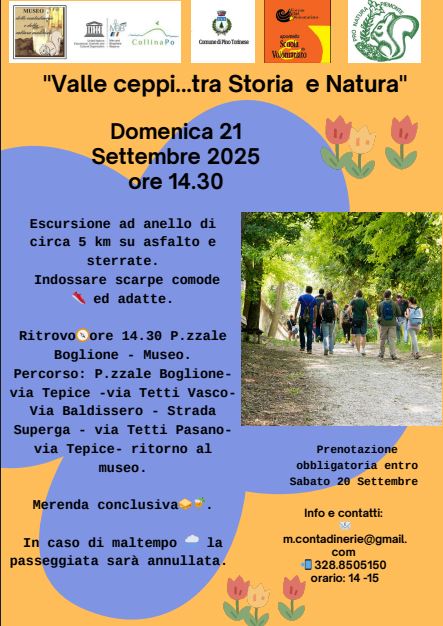 Passeggiata a cura del Museo delle Contadinerie di Pino Torinese. Percorso ad anello di circa 5 Km su asfalto e sterrate. Indossare scarpe comode ed adatte.