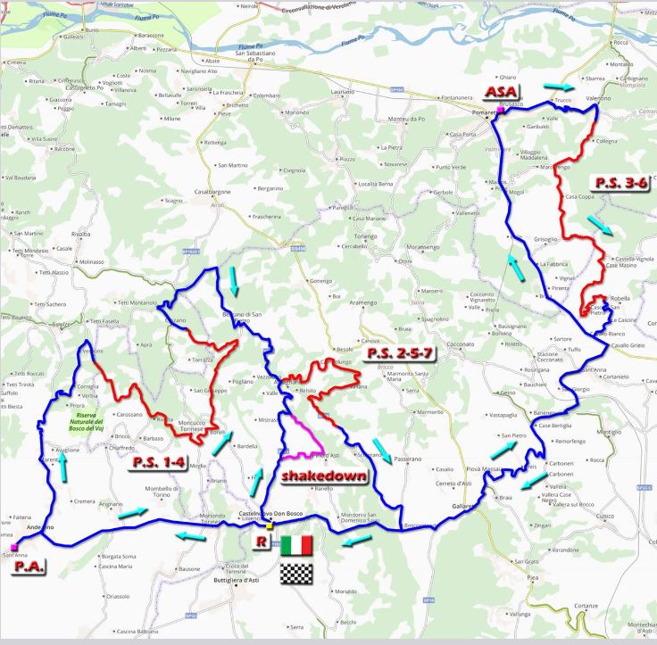 La partenza è posizionata nel Comune di Moncucco Torinese (AT) al confine tra la Città Metropolitana di Torino e la Provincia di Asti con proseguimento in Provincia di Asti sulla Sp. 77 sino al bivio con la Strada Comunale Loc. Rivalta e su detta comunale sino al bivio con la Sp. 32/A, a seguire su detta strada provinciale sino all’abitato di Moncucco Torinese (AT), svolta a destra sulla Sp.32 per poi svoltare a sinistra dopo circa mt. 500,00 sulla Sp. 32/B in Località Borelli; proseguendo sulla Sp.32/B fino ad immissione sulla Sp. 16 sino al bivio con la Sp.16/A e su detta Sp. 16/A sino all’abitato di Cinzano (TO) nella Città Metropolitana di Torino dove è previsto l’arrivo circa 300 m. prima dell’abitato della prova speciale;