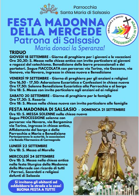 Domenica 21 settembre sarà il giorno della grande festa per la Madonna di Salsasio. Alle 10 nella chiesa nuova S. Messa solenne seguita dalla solenne processione con percorso: via Novara, via Bergamina, via Torino, ingresso in chiesa antica, Affidamento del borgo e della Parrocchia a Maria Madonna della Mercede e Benedizione. Alla celebrazione solenne e alla processione prenderanno parte anche le autorità, le associazioni e la Banda Filarmonica di Carmagnola.
