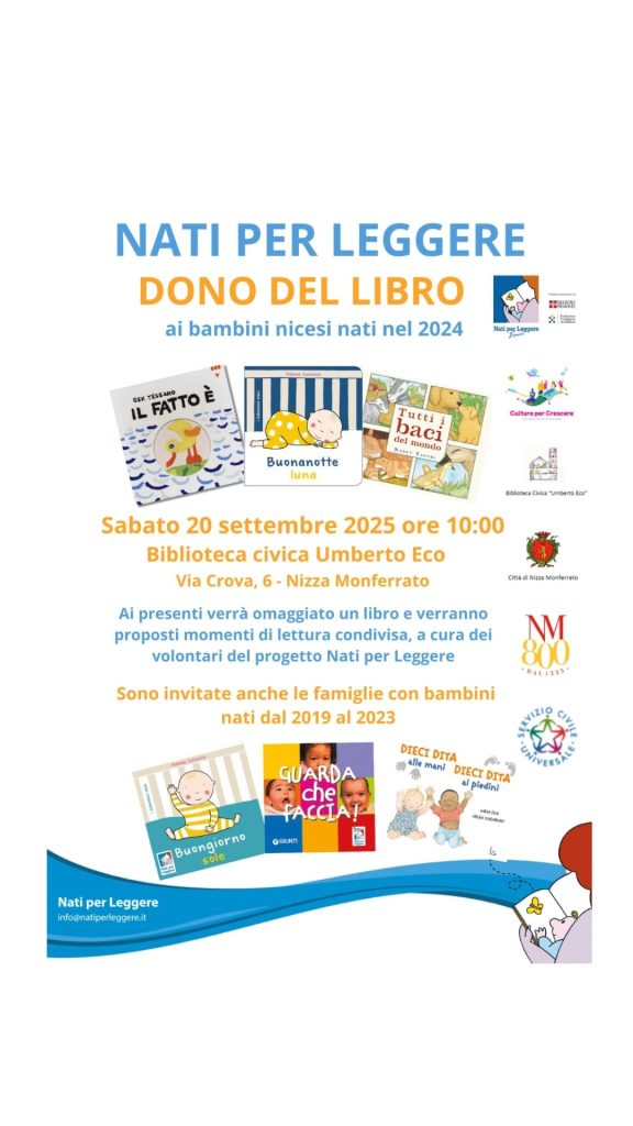 Nell’ambito del programma nazionale “Nati per Leggere”, un libro in dono ai nuovi nati per una comunità che cresce leggendo! Torna anche quest’anno il “Dono del libro”, l’iniziativa per promuovere la lettura in famiglia sin dalla nascita, portata avanti da alcuni anni dal Comune di Nizza in collaborazione con la Biblioteca Civica “Umberto Eco” per introdurli sin da piccoli nel mondo della lettura. È il benvenuto in una comunità di  lettori, convinta che la lettura in famiglia possa essere un’esperienza fondamentale per la crescita armonica dei piccoli, che contribuisce al benessere psico-fisico, allo sviluppo del linguaggio e rivolto alle famiglie con bambini da 0 a 6 anni, che auspica la nascita dell’amore per la lettura nei più piccoli.