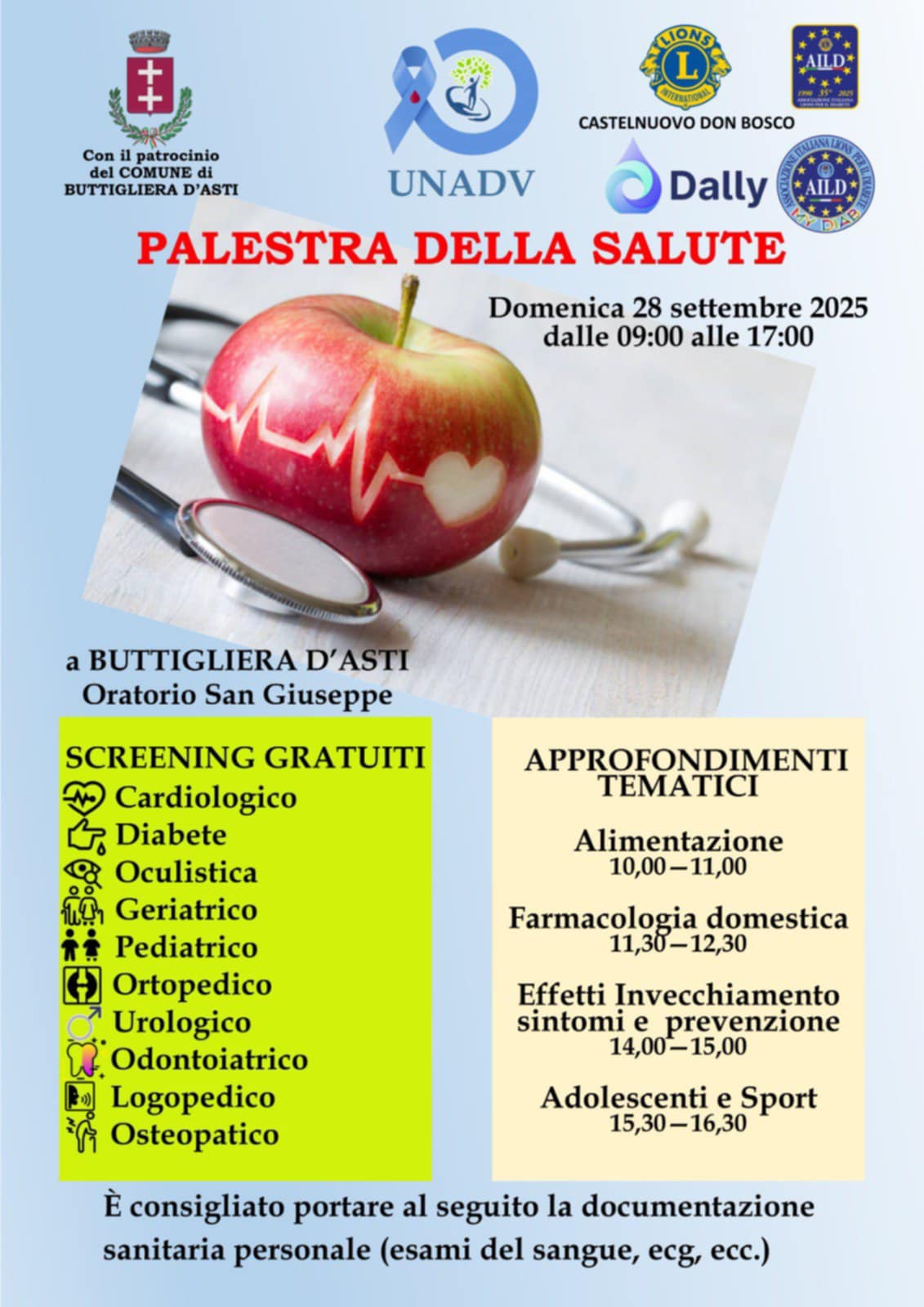 BUTTIGLIERA D’ASTI. Domenica 28 settembre “PALESTRA DELLA SALUTE” presso l’Oratorio San Giuseppe.